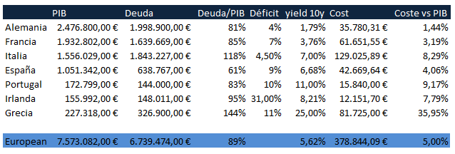 Cada país tiene sus particularidades. Actualmente, tenemos en el epicentro de la crisis a España y Italia. Como podemos comprobar, el problema en España y Portugal no es un problema menos como los casos de Grecia, Irlanda y Portugal. España y Italia suman alrededor de 2,5 billones de euros en deuda. Evidentemente, la deuda está estructurada en diferentes vencimientos lo que sugiere que un fondo de rescate de 1 billón de euros, podría llegar a ser suficiente, ya que es poco probable que lleguen todos los vencimientos de todos los países en problemas a la vez. Entre los PIIGS, suman un total de 3,1 billones de euros por lo que con un fondo de rescate del 33% del total de deuda de dudoso cobro, debería ser suficiente si además, el fondo tiene ficha bancaria y capacidad de apalancamiento, es decir, de pedir prestado al BCE.